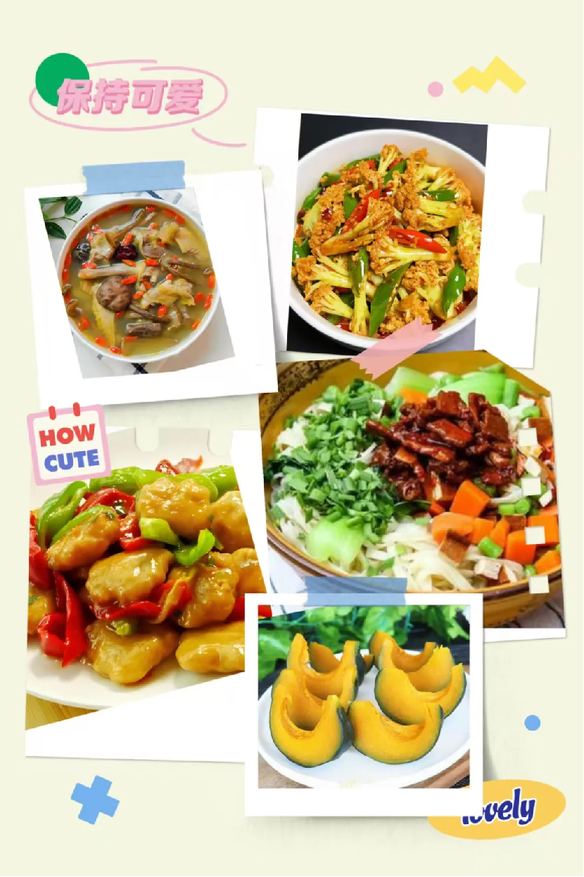 南瓜米饭、杂粮红烧肉、糖醋里脊、豉油包菜炒粉条、西红柿蛋花汤