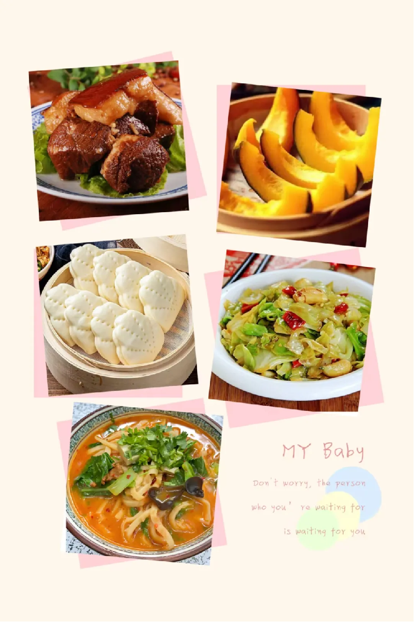 西红柿鸡蛋剪刀面、粉蒸肉、莲藕小炒炒肉、葱油奶白菜、荷叶饼